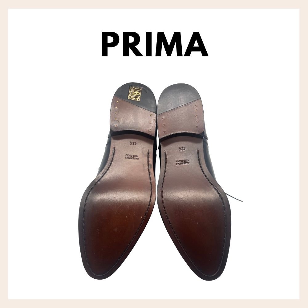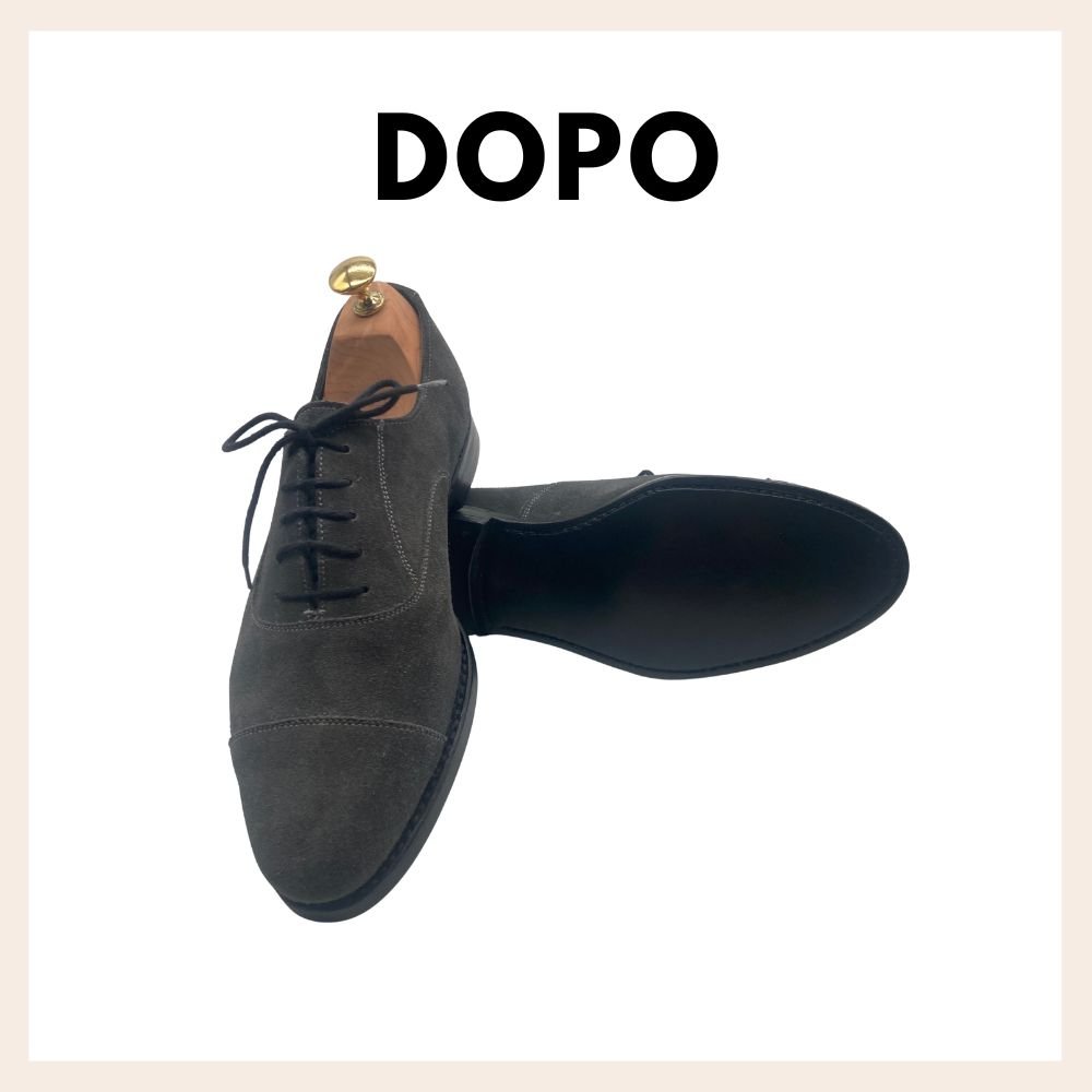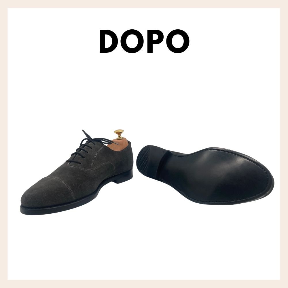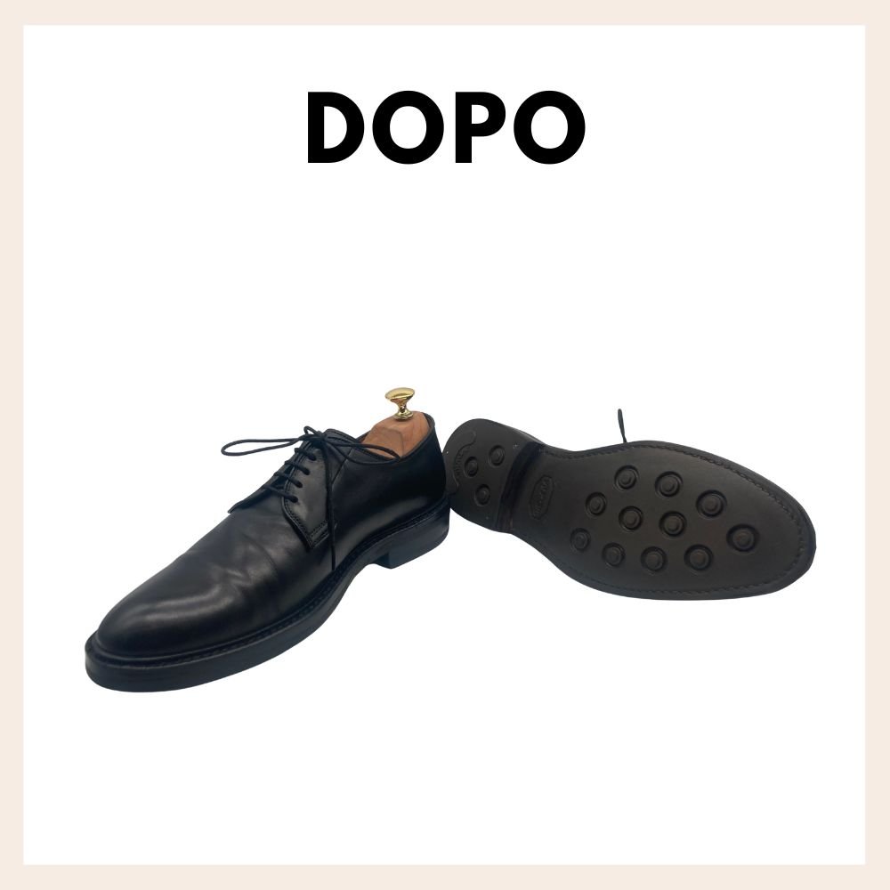 Risuolatura competa in cuoio su scarpa classica stile inglese. In questa lavorazione è stata staccata la vecchia suola in cuoio e sostituita con una nuova, cucita e lucidata